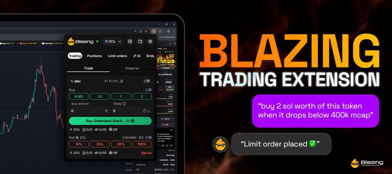 Blazing Extension adds fast trading to top crypto sites. Manage multiple wallets, place limit orders, bridge across chains, and trade with AI text commands from one browser panel.