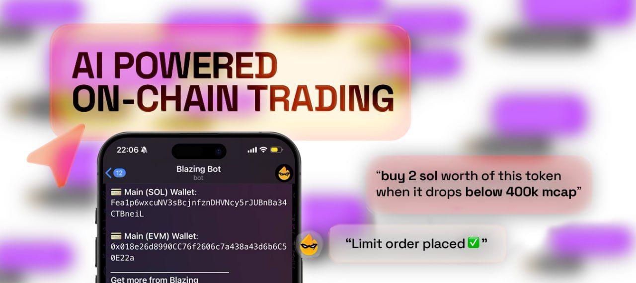 Blazing is a Telegram trading bot with AI actions and cross-chain buys. Trade across nine chains, manage wallets, bridge funds, and execute fast trades from one chat interface.