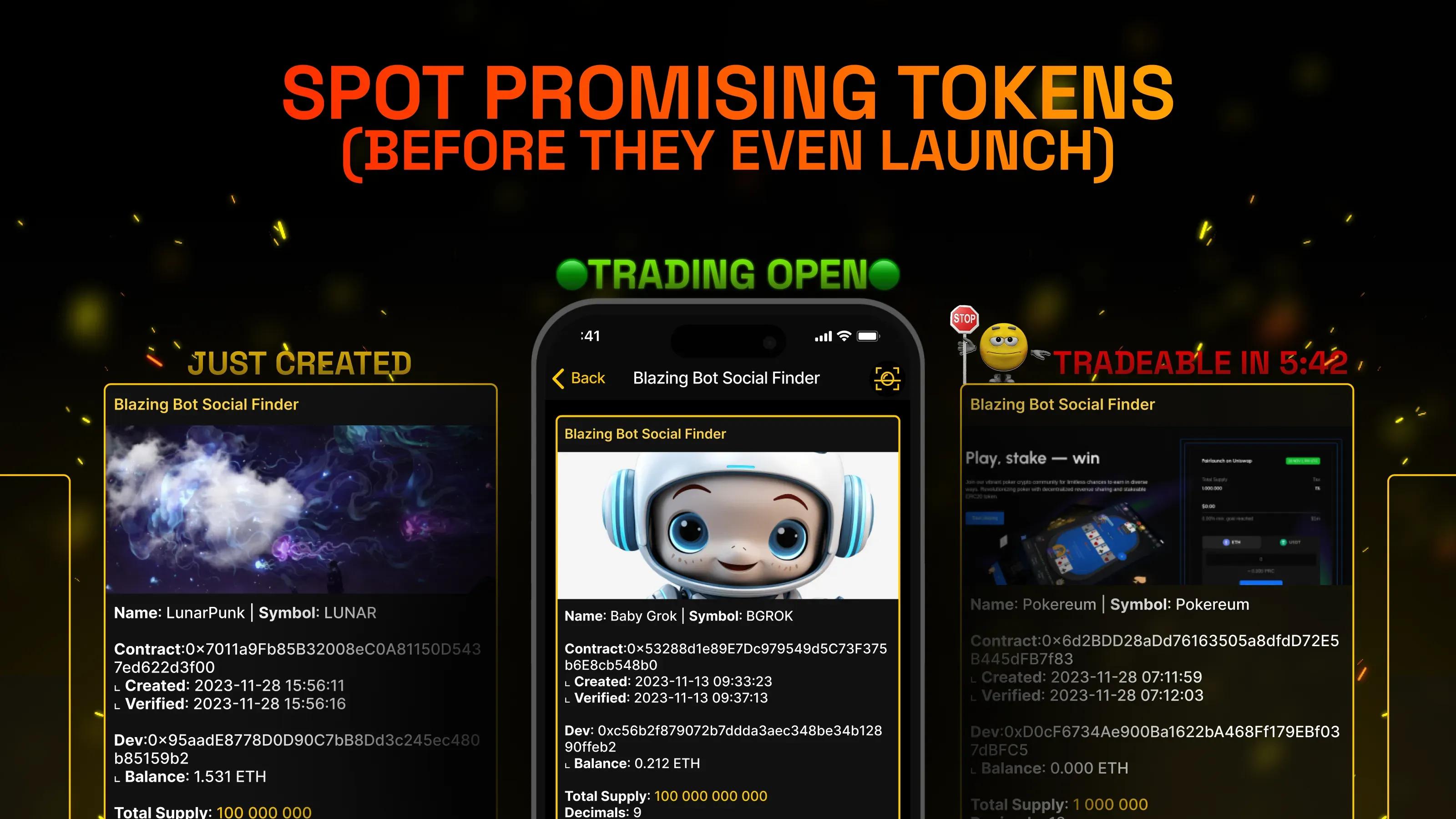 Discover how to spot new crypto tokens with the Social Token Finder before they explode on Twitter. This free tool auto-scans Etherscan for fresh contracts, pulls socials, and delivers key data like dev wallet holdings and tokenomics in real-time via Telegram. Learn to filter scams, check for honeypots, and act fast with Blazing Trading Suite for maximum gains.